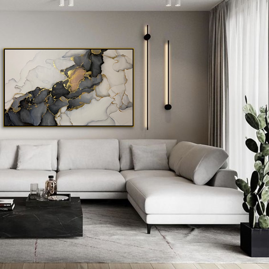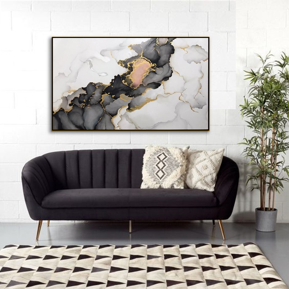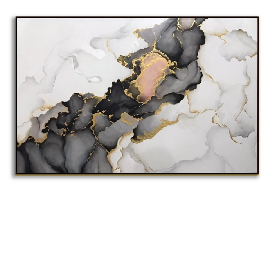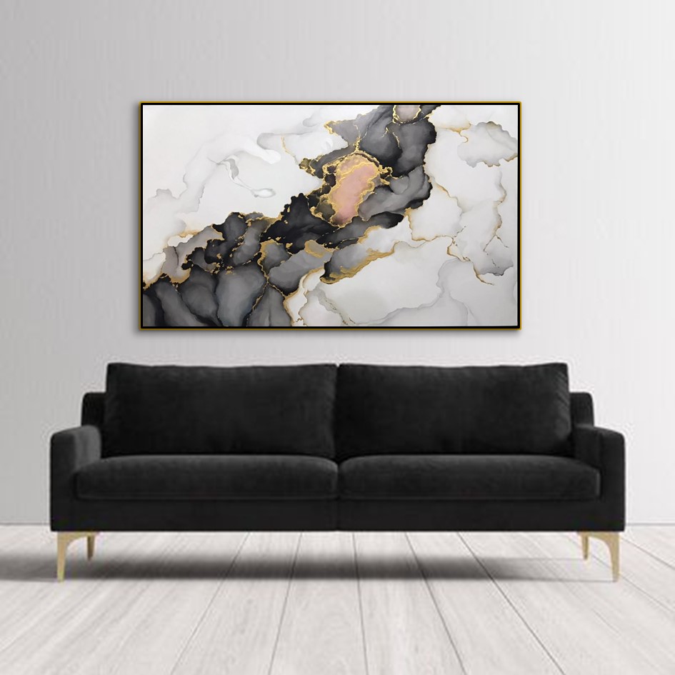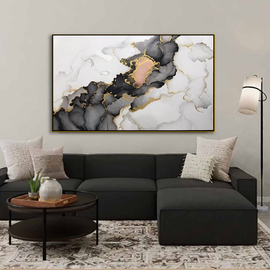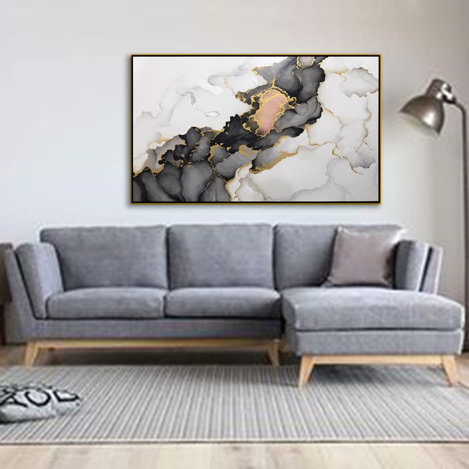 Esta obra abstracta evoca la fuerza elegante de la naturaleza mineral, como vetas de mármol atravesadas por ríos de luz. Las formas orgánicas fluyen libremente sobre el lienzo, donde los negros profundos y grises ahumados contrastan con blancos etéreos, generando una sensación de movimiento y profundidad.