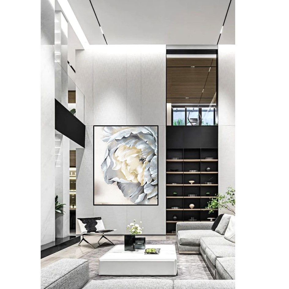 Una flor en plena apertura protagoniza la composición, desplegando pétalos en suaves matices marfil, gris perla y delicados toques dorados. La obra transmite una sensación de serenidad y refinamiento, donde cada capa parece envolver a la siguiente con una sutileza casi etérea.