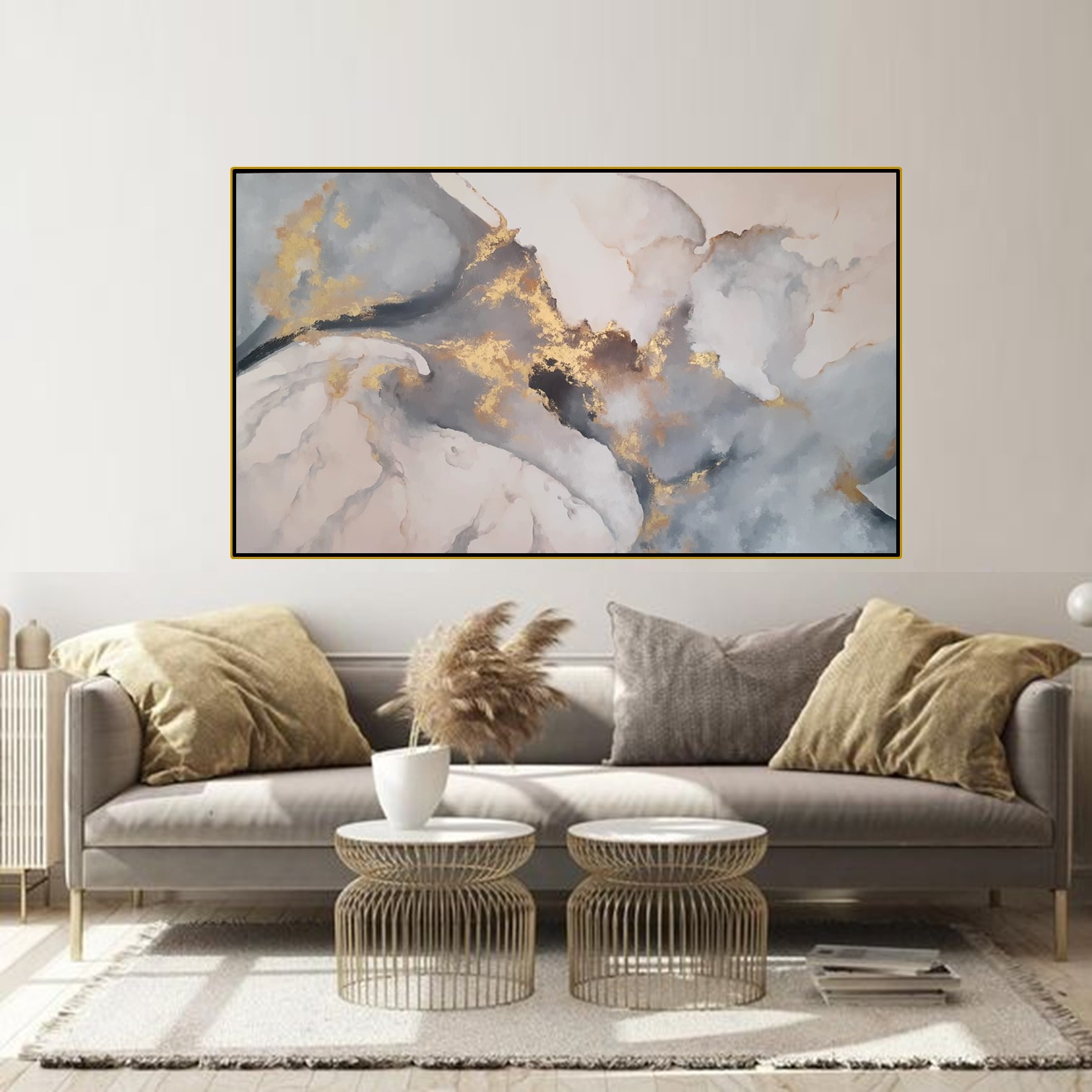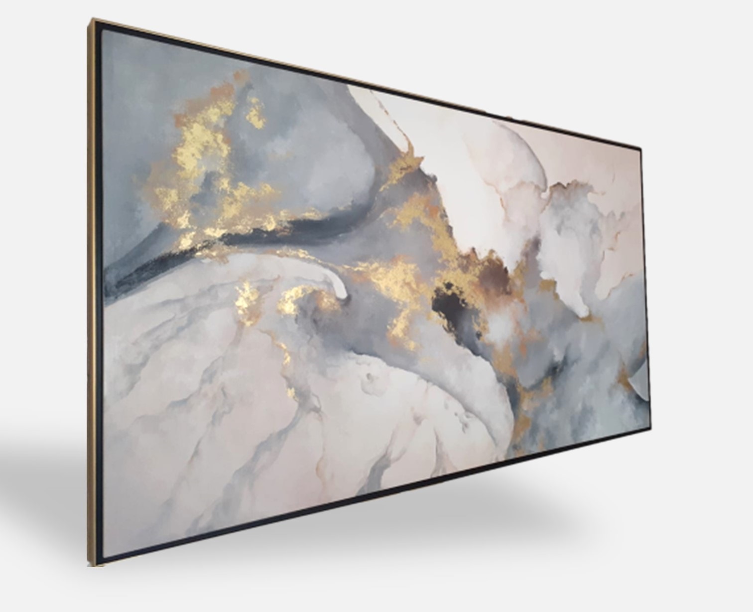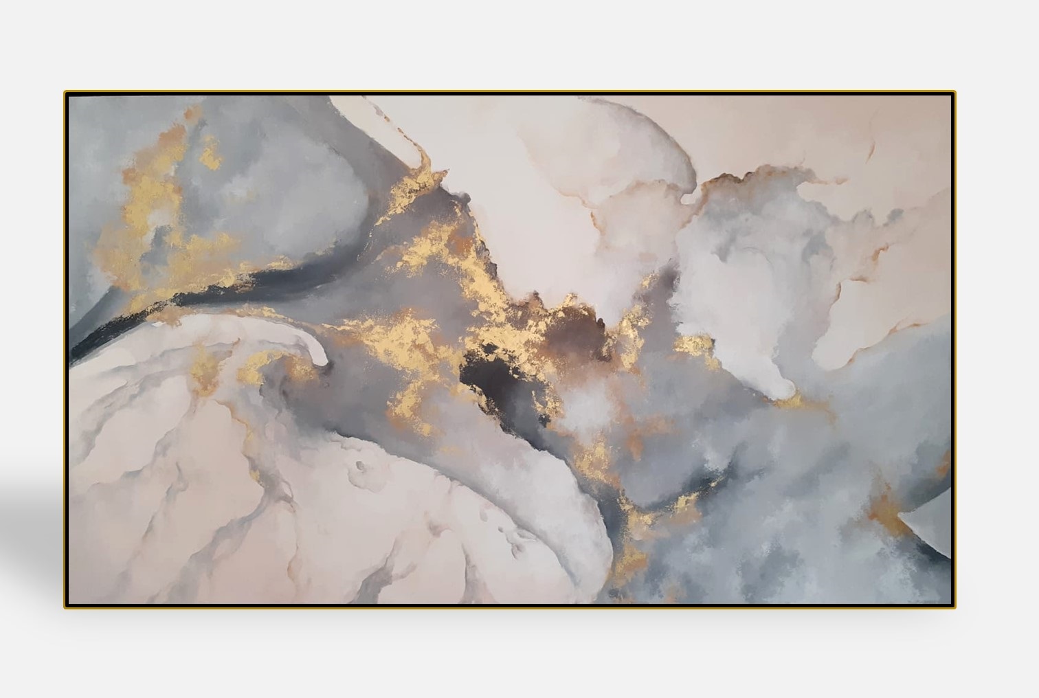 170×100 cm – Pintada a mano con aplicaciones de hoja de oro y pigmentos puros en dorado. Su composición abstracta combina tonos suaves en gris, blanco y beige con destellos dorados que aportan elegancia y luminosidad.