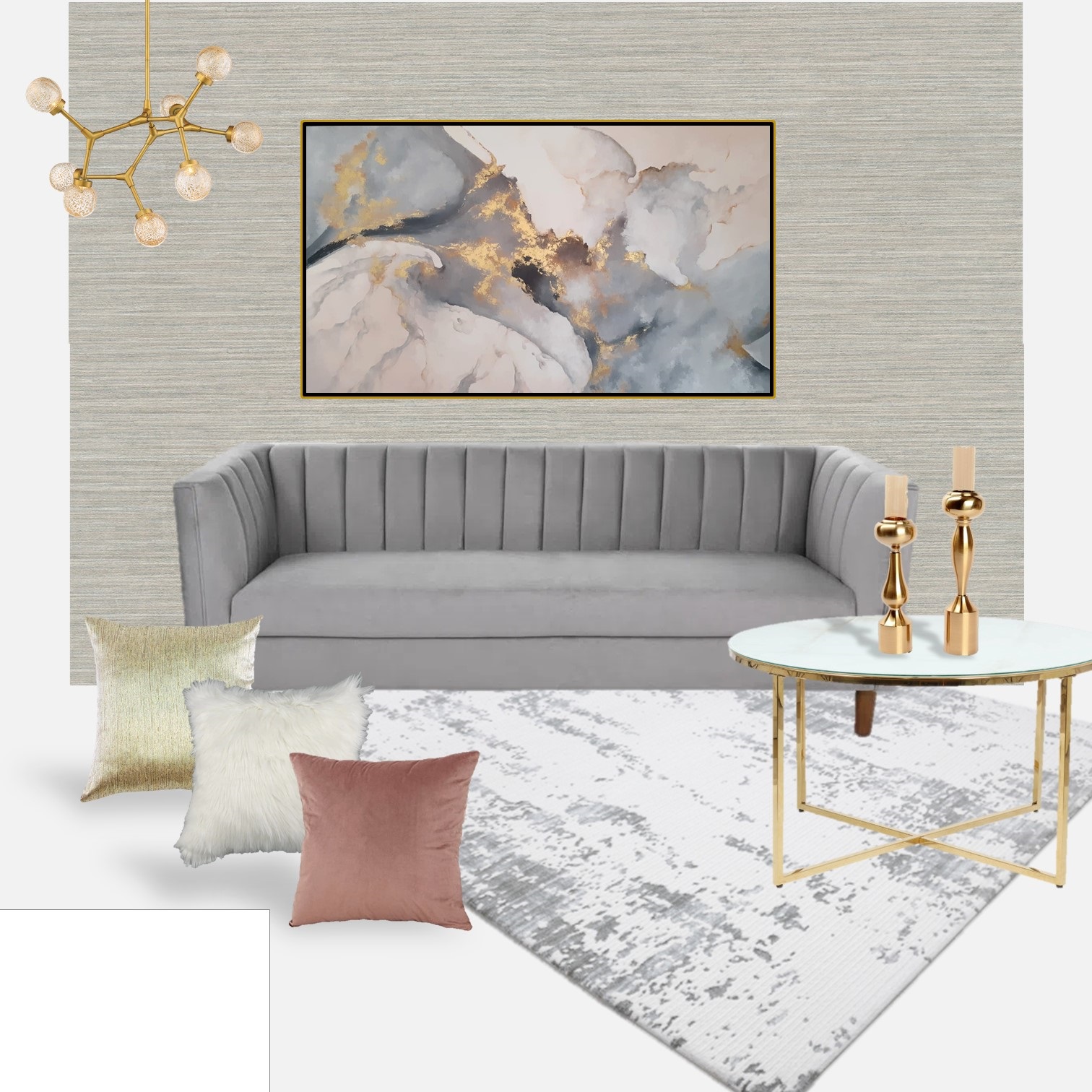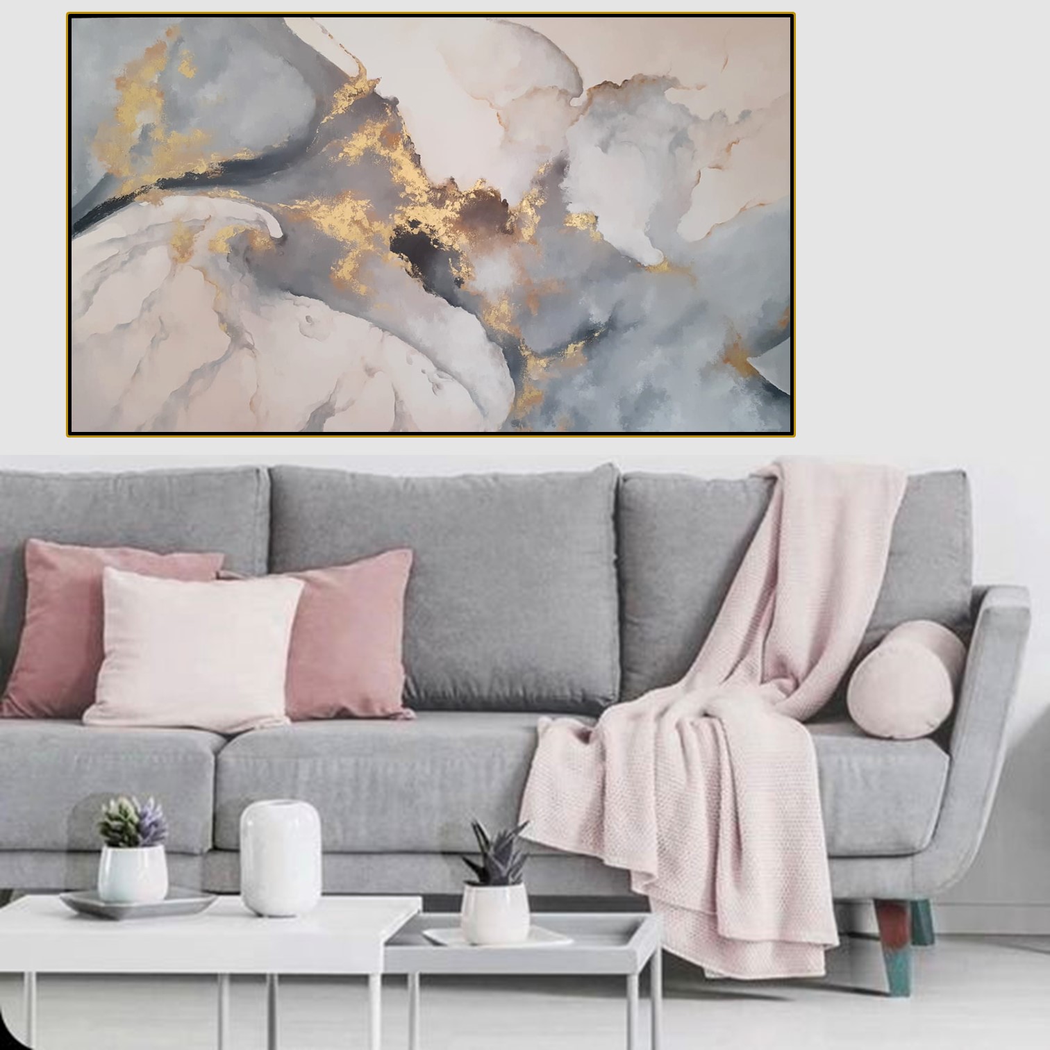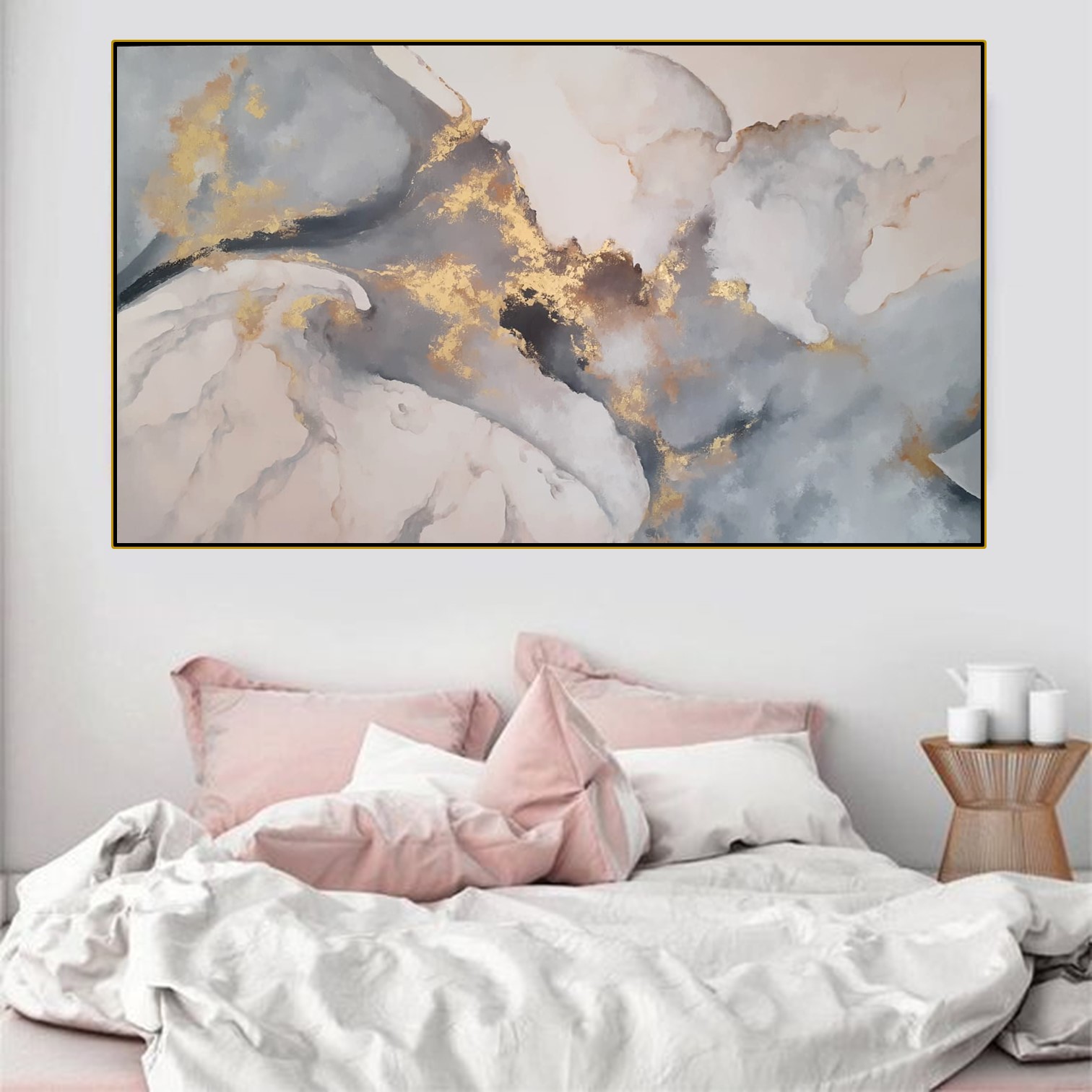 170×100 cm – Pintada a mano con aplicaciones de hoja de oro y pigmentos puros en dorado. Su composición abstracta combina tonos suaves en gris, blanco y beige con destellos dorados que aportan elegancia y luminosidad.